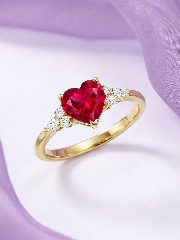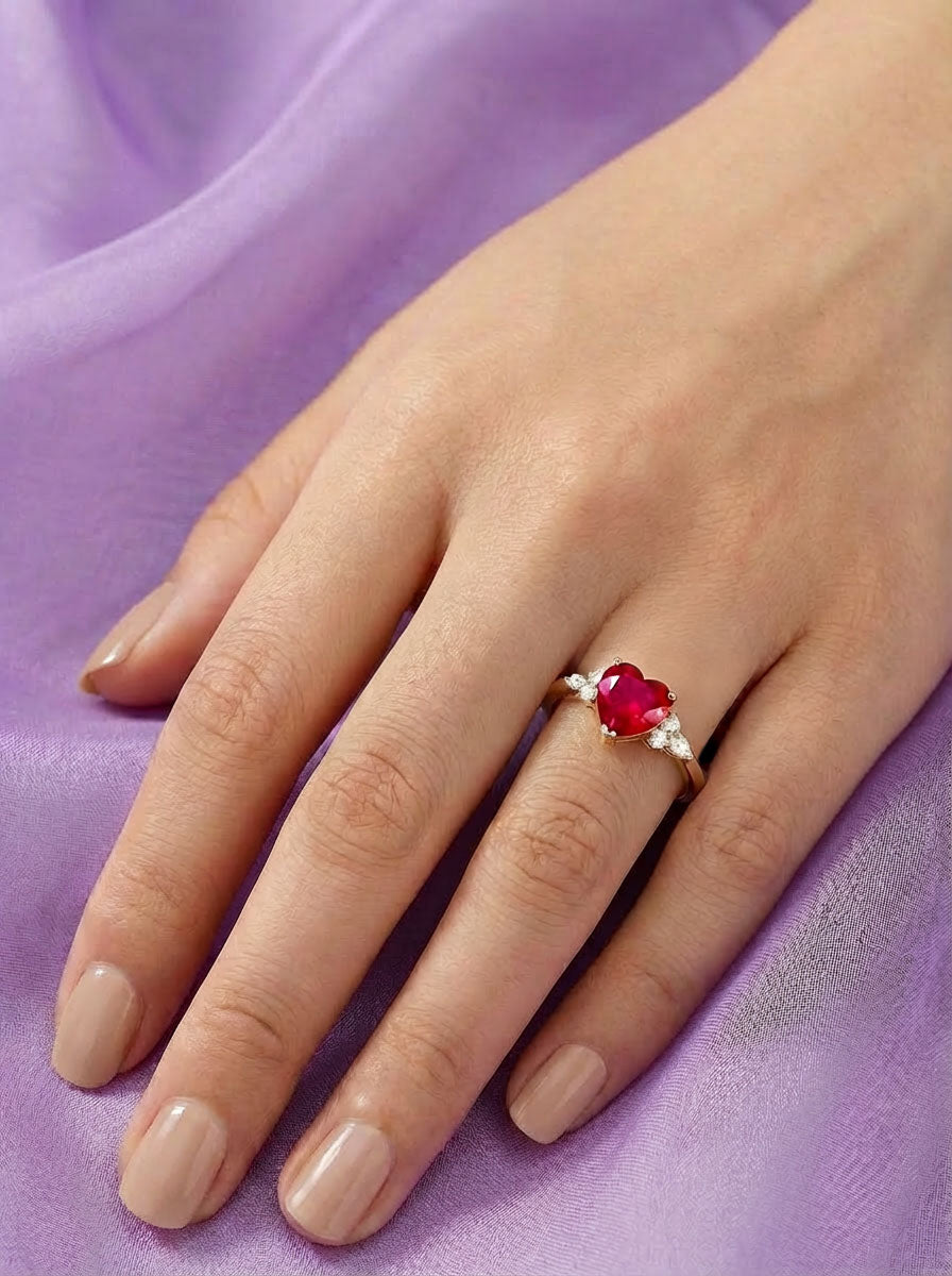 At its centre, a heart-shaped ruby glows with deep passion, set in warm gold and framed by delicate clusters of diamonds on either side. Rich in symbolism and emotion, this ring embodies a promise of loyalty, desire, and a love that is chosen — fiercely and forever.