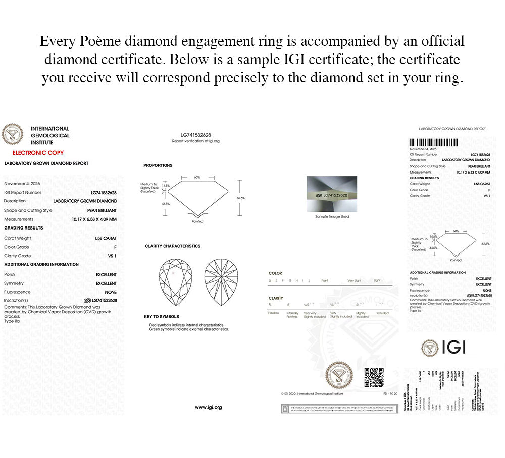 - Crafted in gold or platinum, and hand-set with a 1 carat marquise cut lab-grown diamond, accompanied by an IGI diamond certificate. The 1ct diamond is approximately 5*10mm.