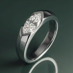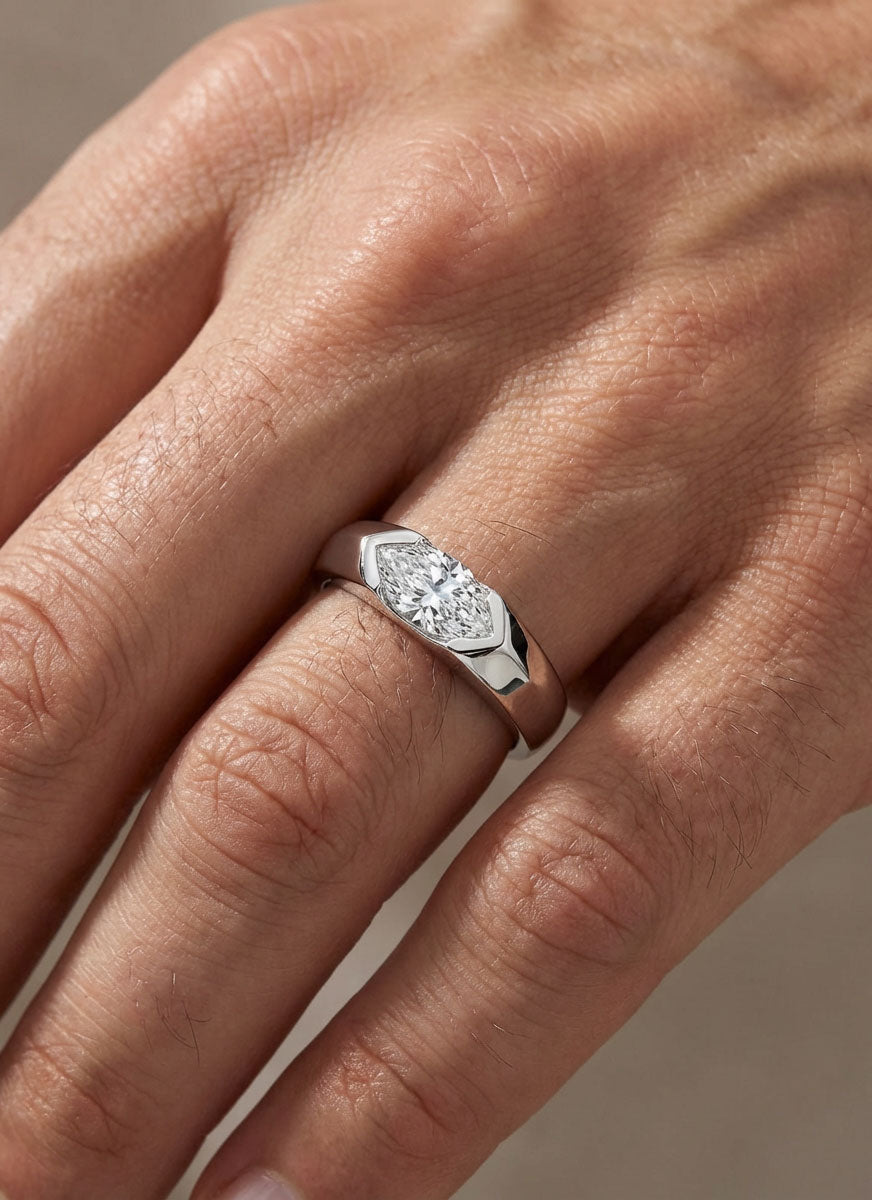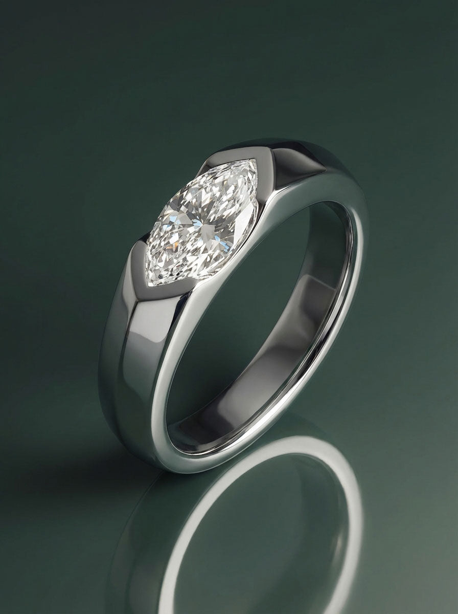 Gravitas is a men’s wedding band defined by strength and quiet authority. Designed for the discerning groom, it features a striking 1 carat marquise-cut diamond set in a protective half bezel. A sleek, modern profile ensures durability, comfort, and understated elegance for a lifetime of everyday wear.