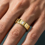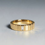 The Keystone Ring is crafted in precious gold and defined by architectural restraint. A single baguette-cut diamond sits at its centre—clean, deliberate, essential. Symbolising strength and stability, this ring embodies quiet luxury, modern masculinity, and the enduring power of commitment.